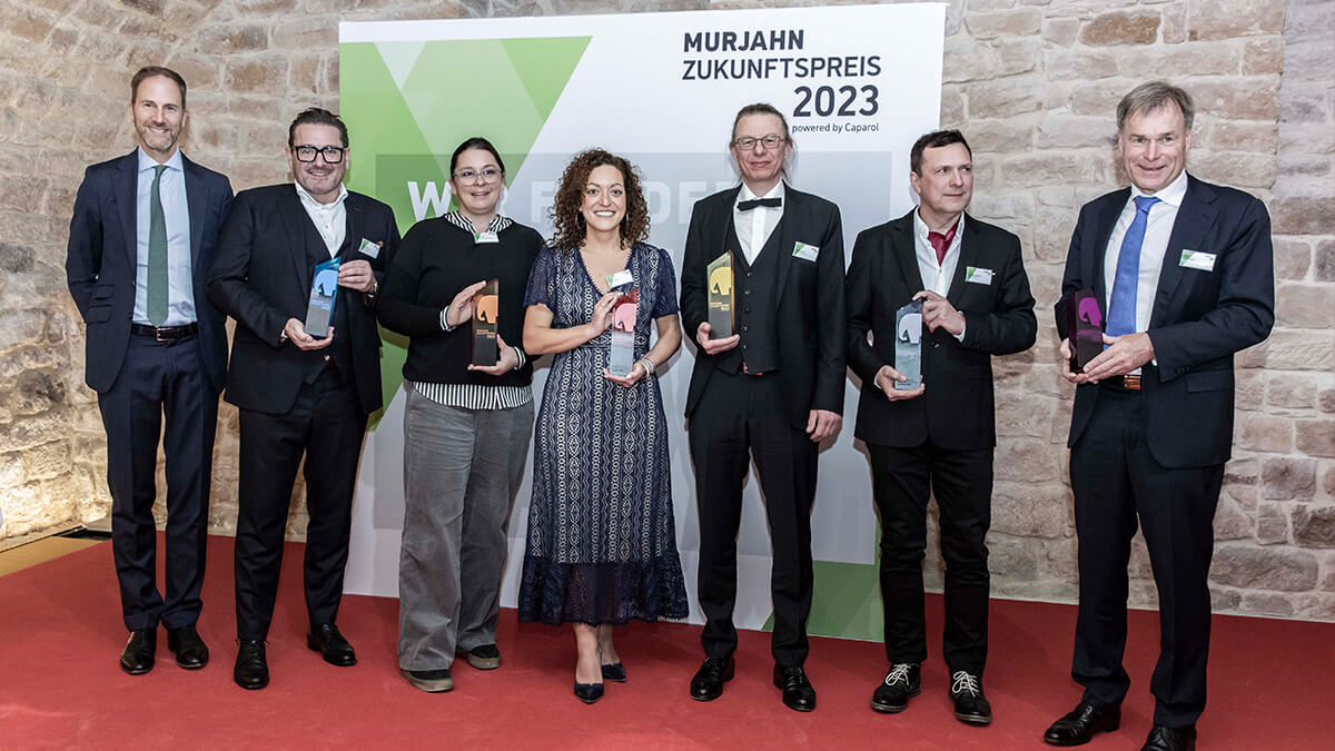 Bei der Preisverleihung (von links): Caparol-Firmenchef Ralf Murjahn mit den Preisträgern Christian Bosold, Sophia Lauton, Sophie Gebauer, Matthias Eckert, Dr. Thomas Winkler und Ulrich Temps.